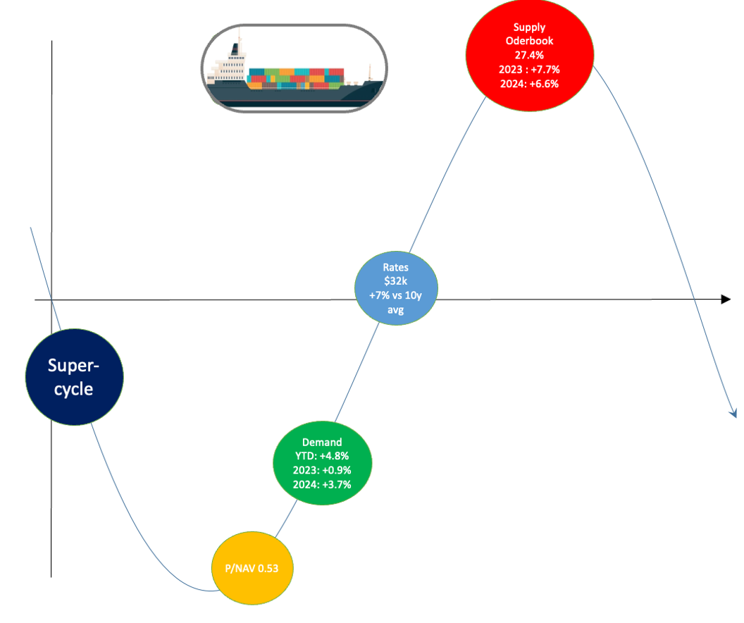 - Potential für eine Erholung hoch (unterstützt durch wenige Schiffe, die auch noch altern); Zeitraum bis zur Erholung unsicher – Risiko Dead-Money für 1-2 Jahre hoch